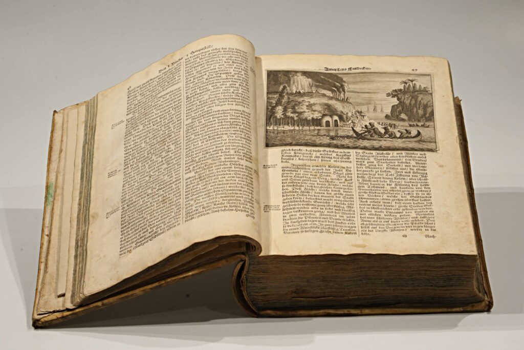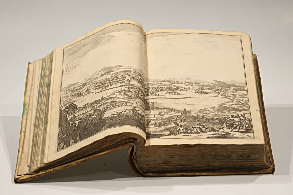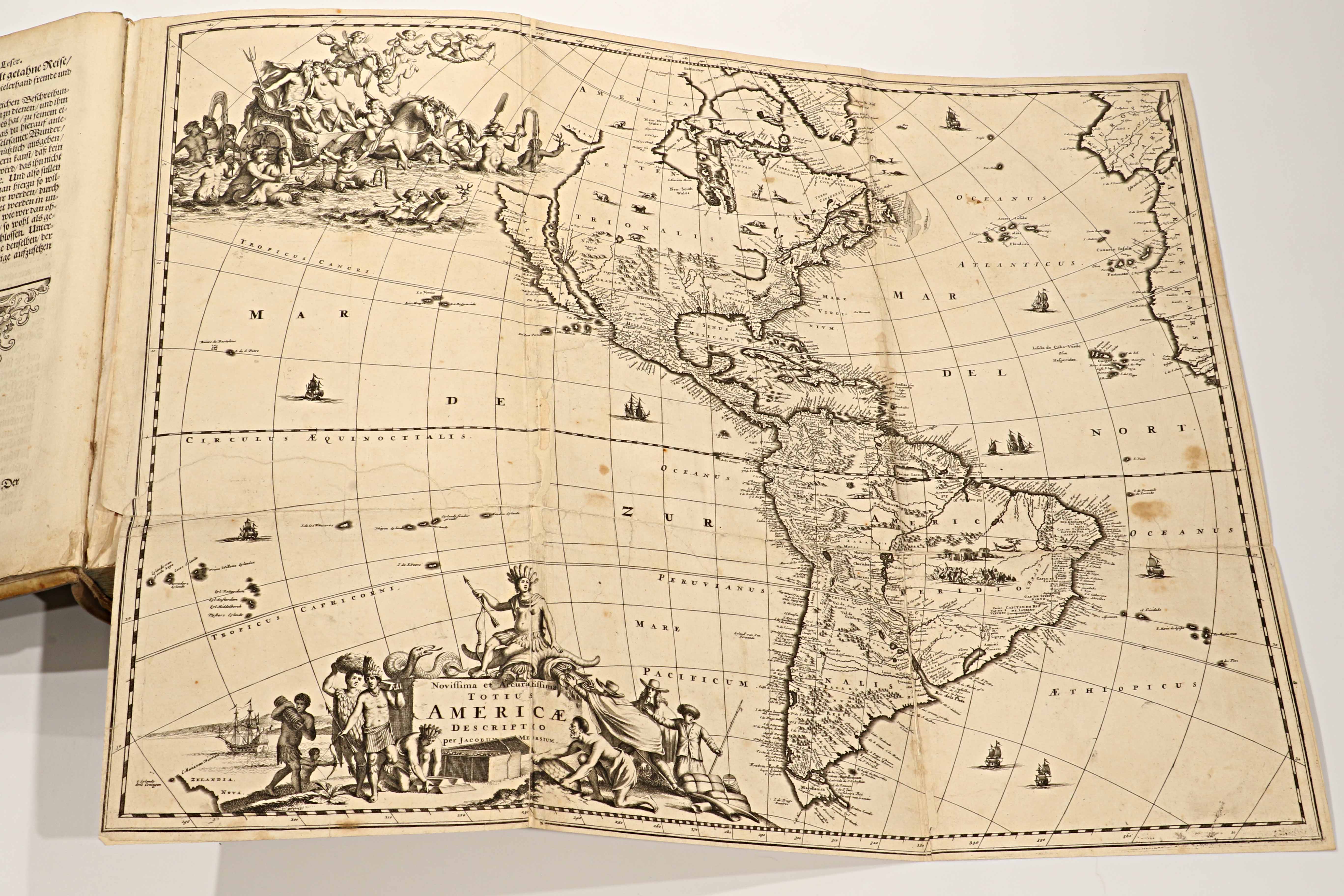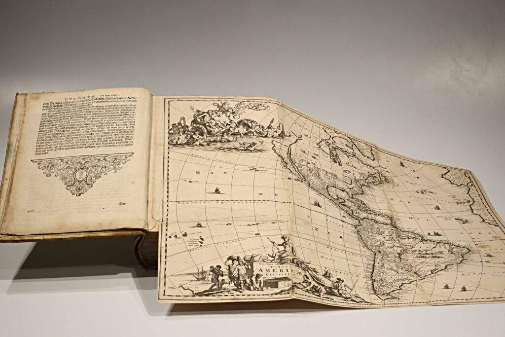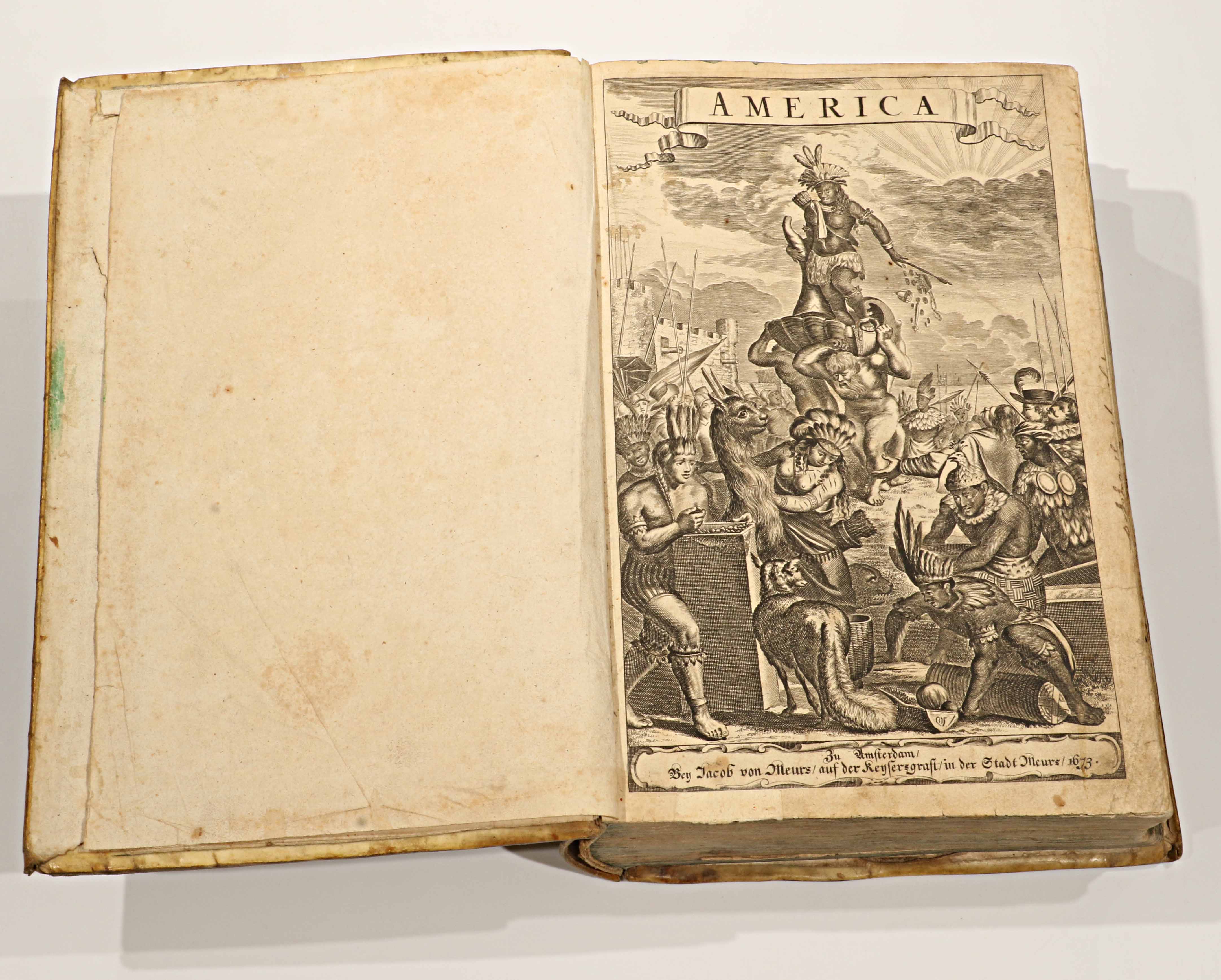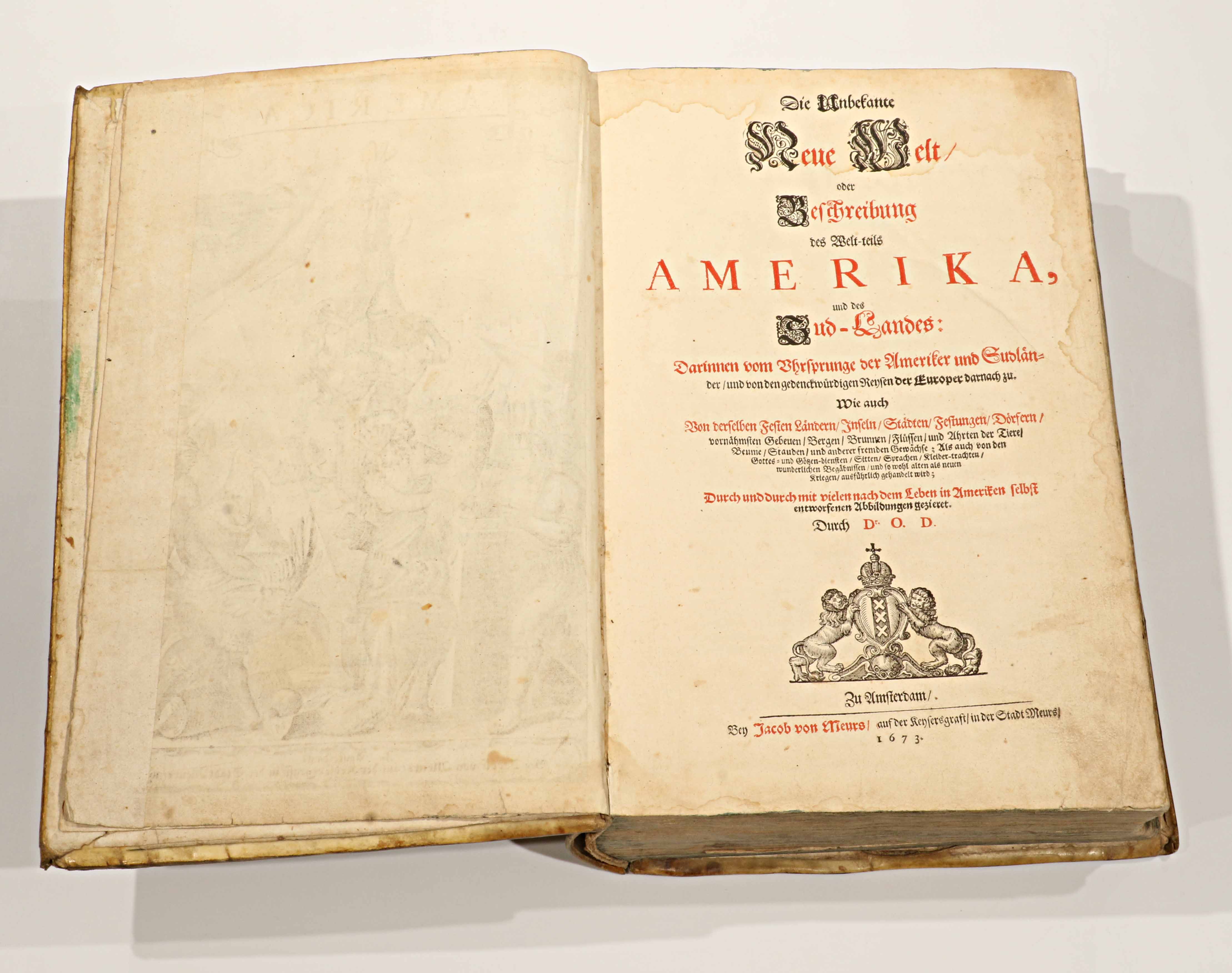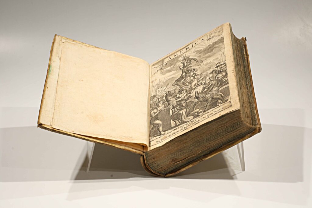 Publicada en 1673, esta edición en alemán —Die unbekannte neue Welt, oder Beschreibung des Welt-Teils Amerika (“El nuevo mundo desconocido, o descripción de la parte del mundo llamada América”)— es la traducción directa de la monumental Amerika: De Nieuwe en Onbekende Weereld (Ámsterdam, 1671), obra del erudito neerlandés Arnoldus Montanus. Impresa y grabada en el taller de Jacob von Meurs, se cuenta entre las más ambiciosas y hermosas descripciones del Nuevo Mundo realizadas en el siglo XVII, ejemplo máximo del esplendor editorial de la imprenta holandesa.