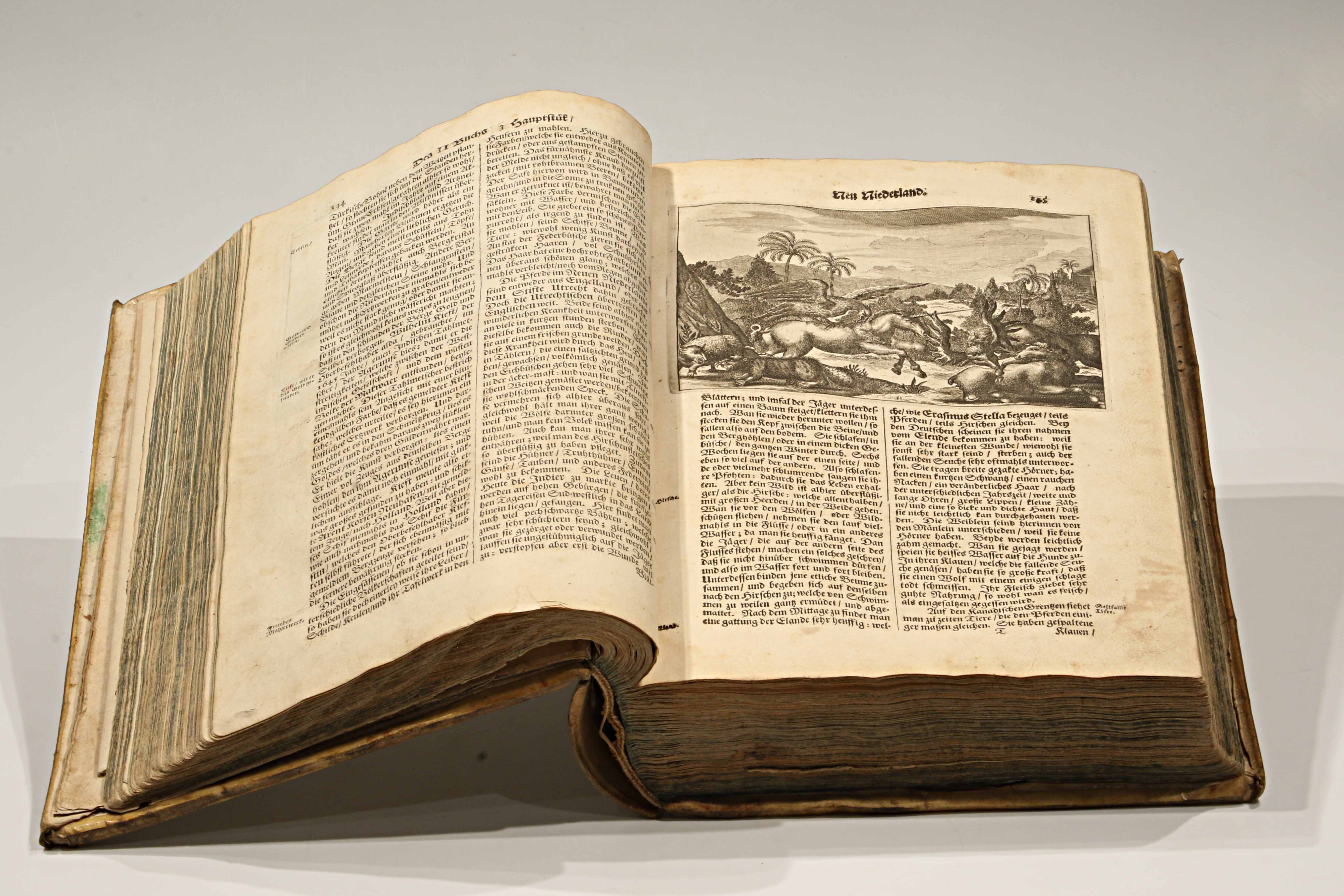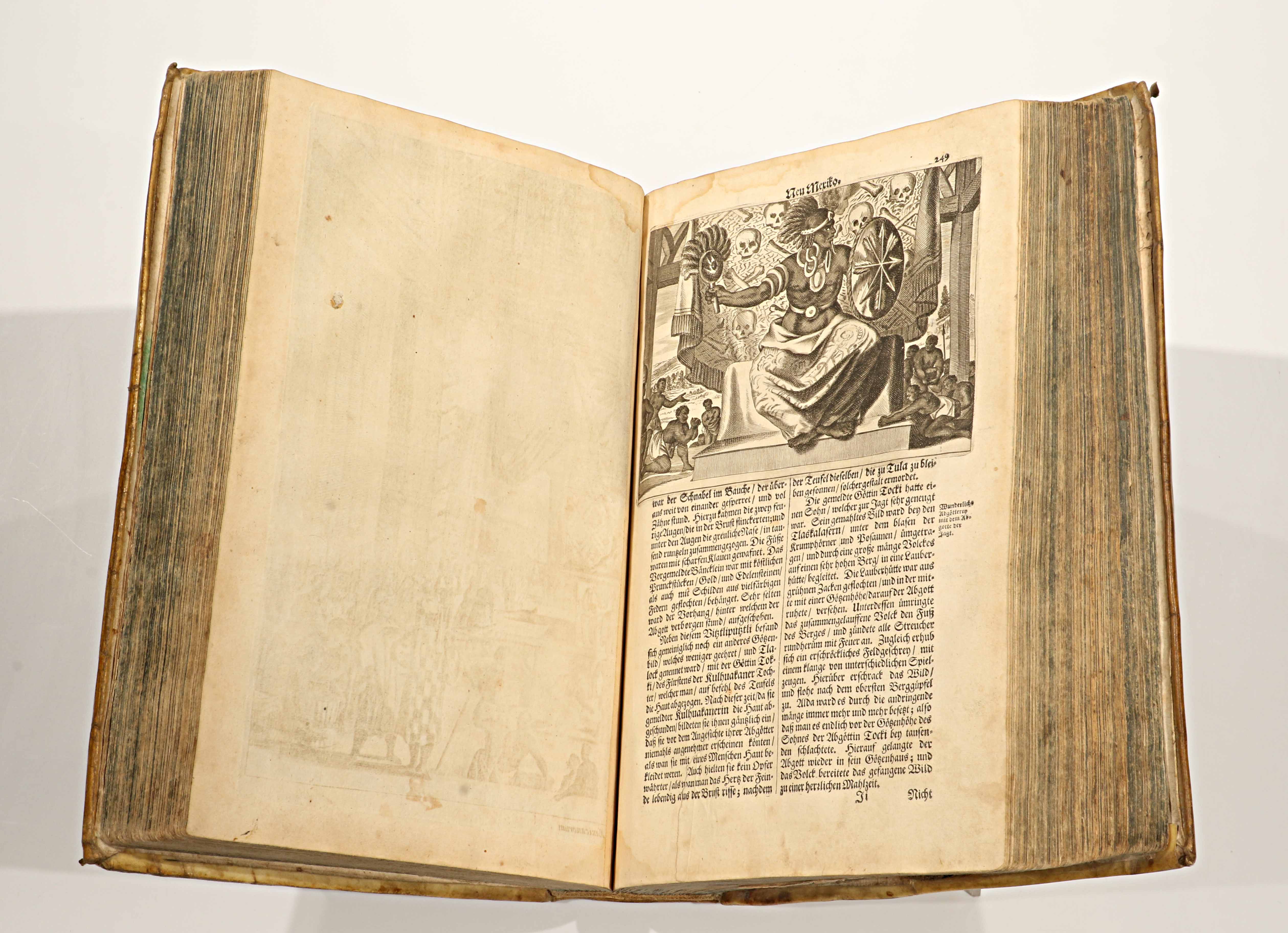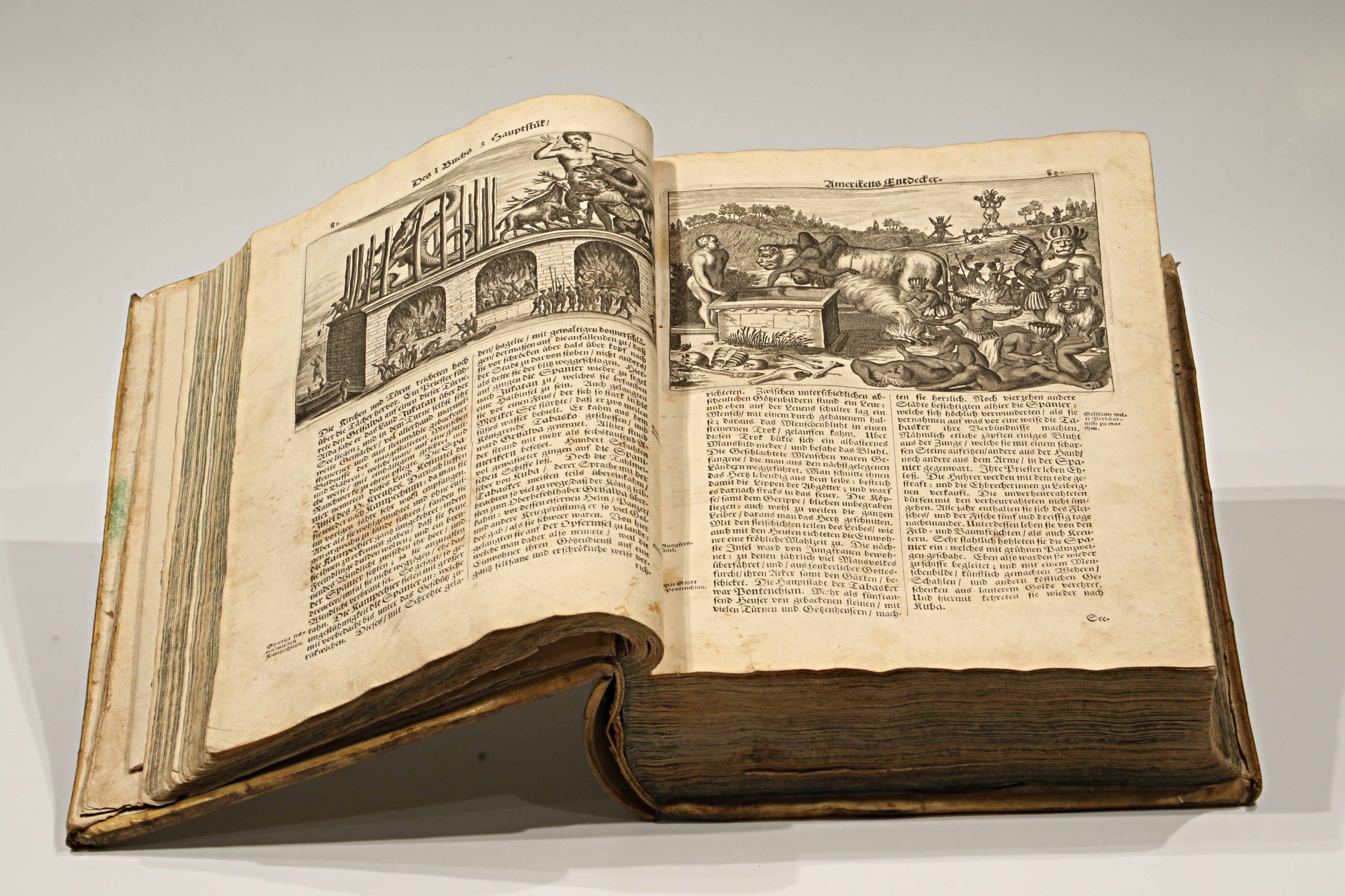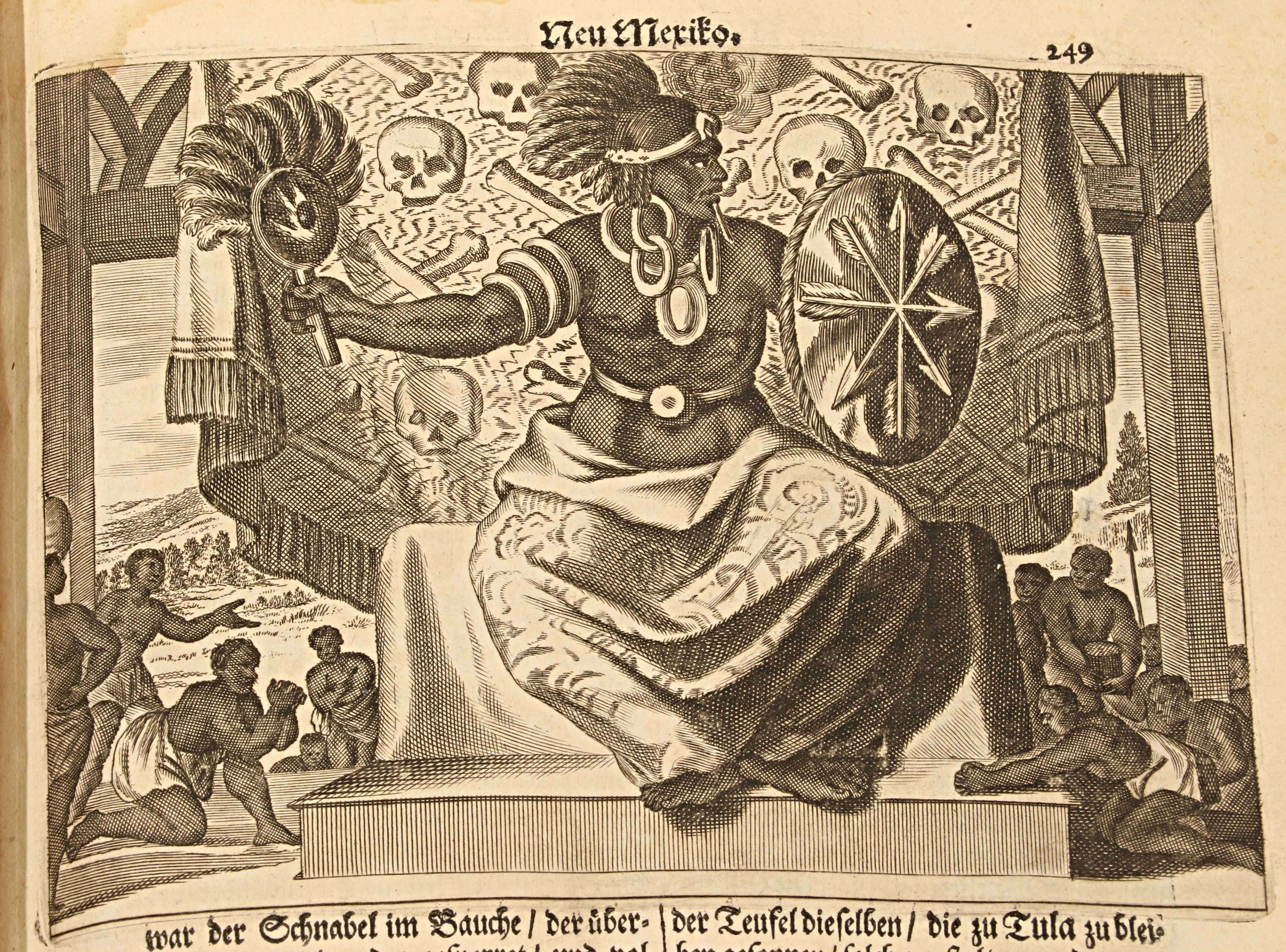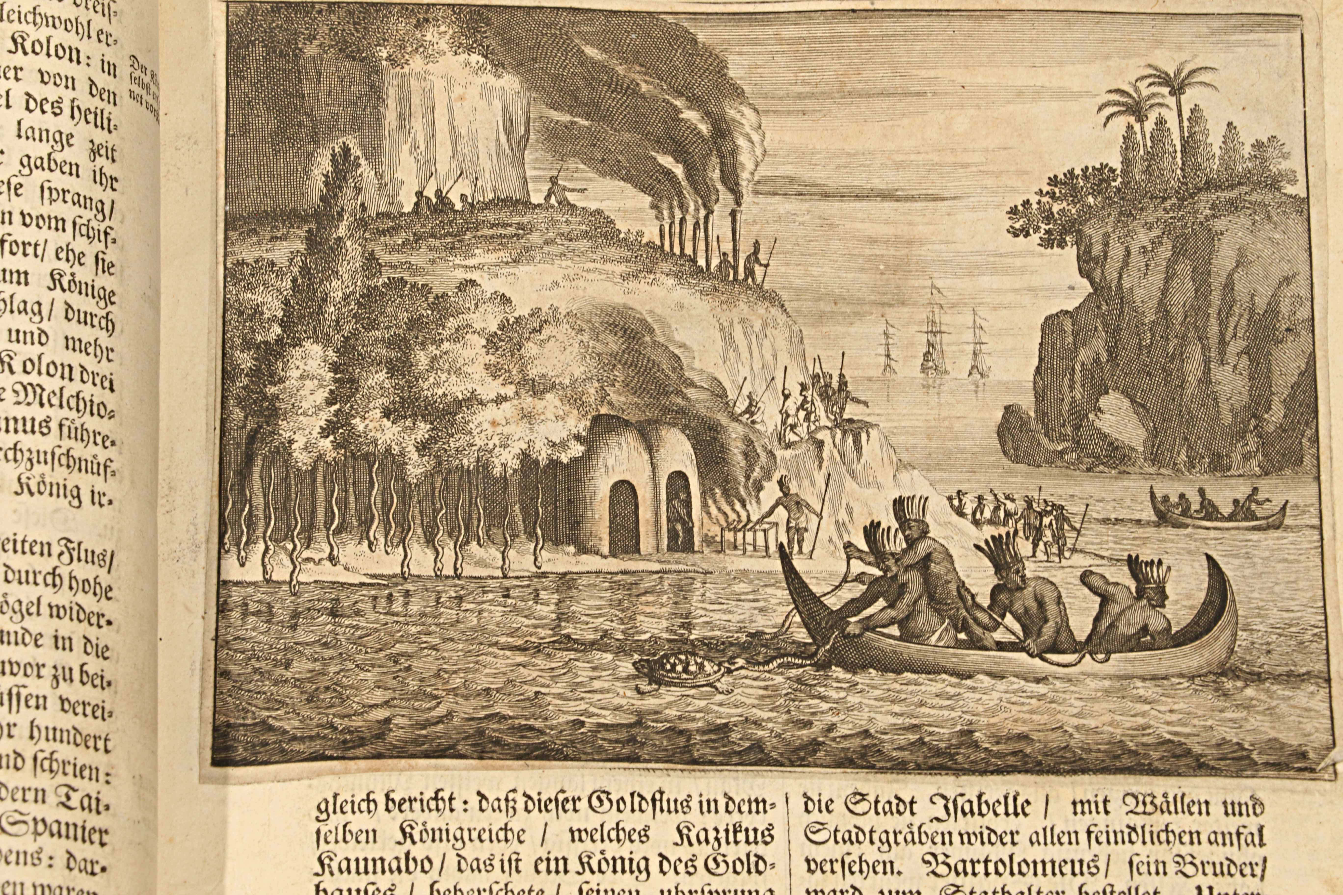 Publicada en 1673, esta edición en alemán —Die unbekannte neue Welt, oder Beschreibung des Welt-Teils Amerika (“El nuevo mundo desconocido, o descripción de la parte del mundo llamada América”)— es la traducción directa de la monumental Amerika: De Nieuwe en Onbekende Weereld (Ámsterdam, 1671), obra del erudito neerlandés Arnoldus Montanus. Impresa y grabada en el taller de Jacob von Meurs, se cuenta entre las más ambiciosas y hermosas descripciones del Nuevo Mundo realizadas en el siglo XVII, ejemplo máximo del esplendor editorial de la imprenta holandesa.