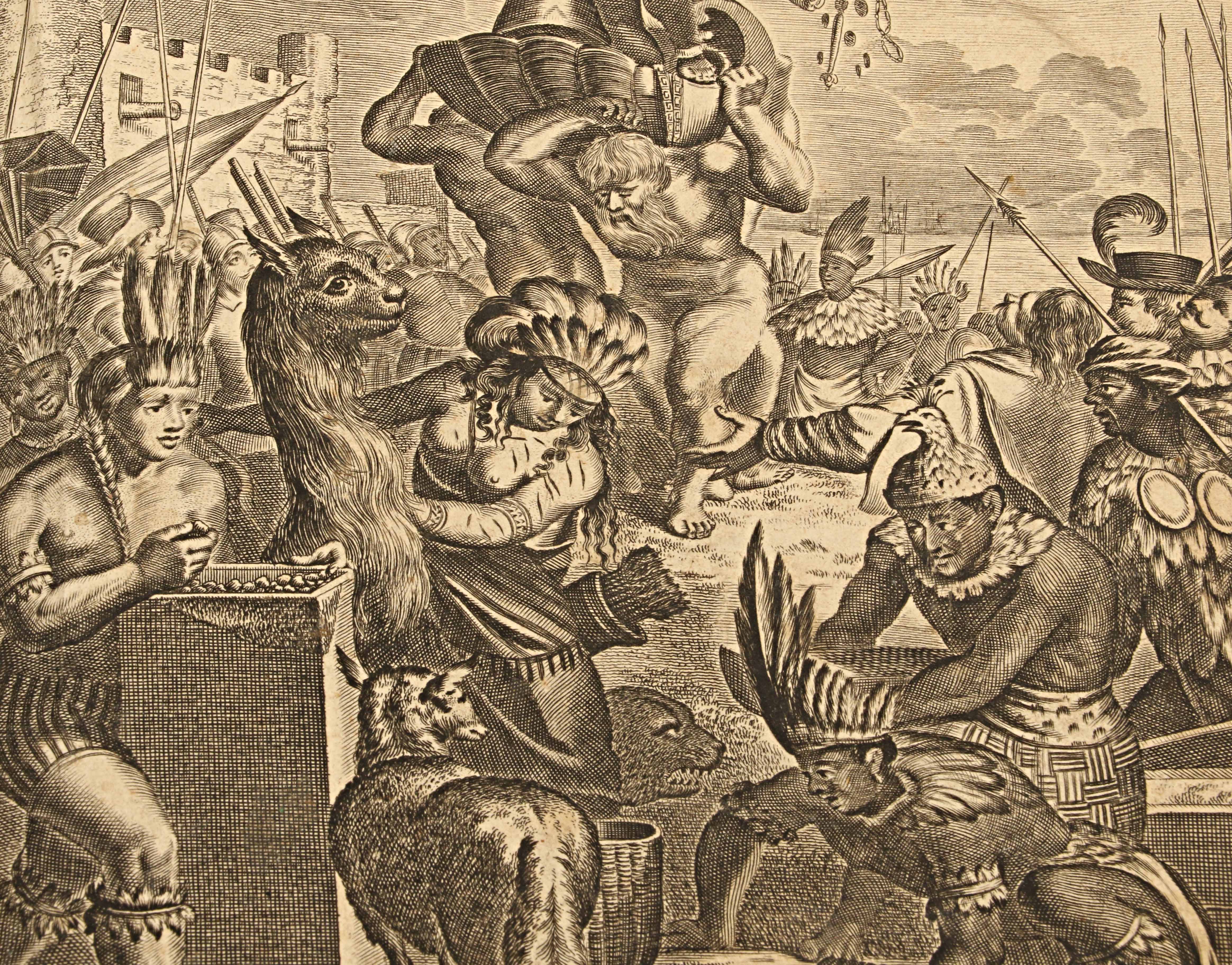 Montanus —teólogo y humanista que nunca viajó a América— construyó su relato a partir de las crónicas de los grandes exploradores y cronistas: Gonzalo Fernández de Oviedo, José de Acosta, Antonio de Herrera y Tordesillas, Girolamo Benzoni y Theodor de Bry, entre otros. Los grabadores del taller de Meurs, guiados por estas fuentes, materializaron un continente tan real como imaginado, donde la precisión geográfica convive con el mito y la fantasía.